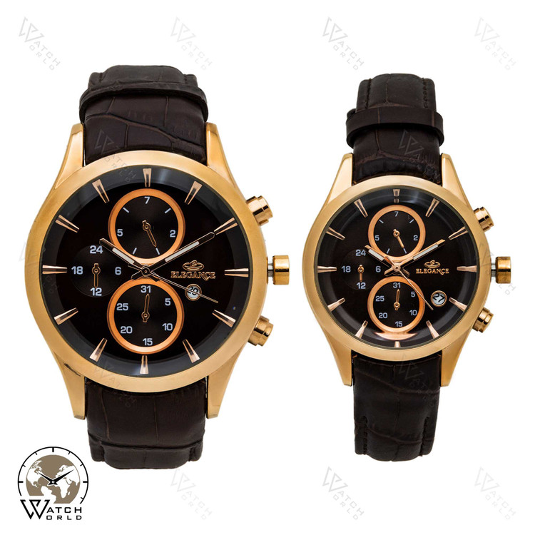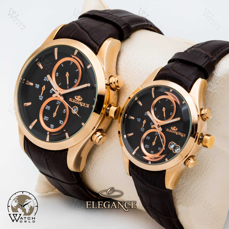 ساعت مچی عقربه ای ست زنانه و مردانه الگانس با موتور میوتای ژاپن و متریال قاب استیل و بند چرم با کیفیت به همراه جعبه زیبا و یکسال گارانتی.