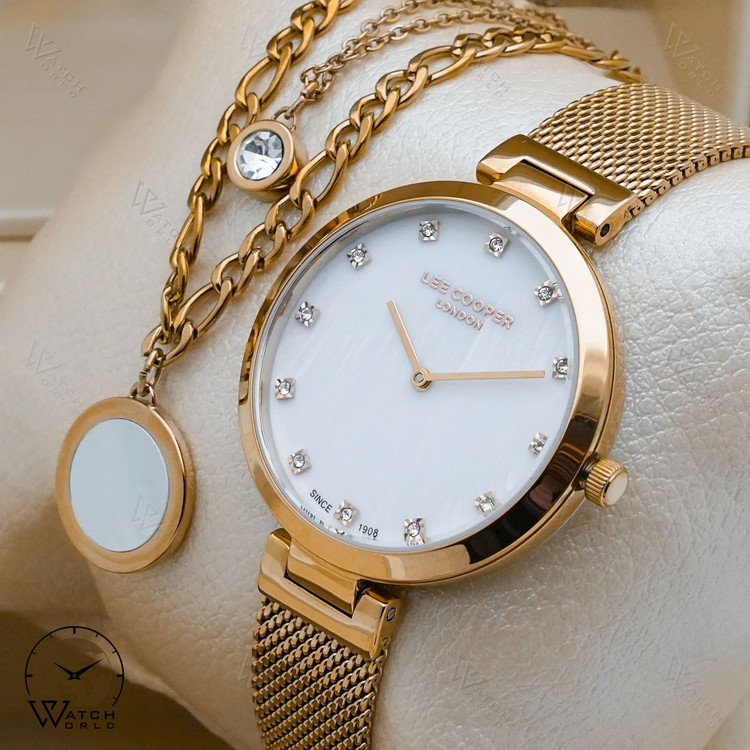 ساعت مچی عقربه ای زنانه برند اورجینال لی کوپر با موتور میوتای ژاپن و متریال قاب و بند استینلس استیل به همراه گردنبند بسیار زیبا و جعبه و پاکت و یکسال گارانتی.