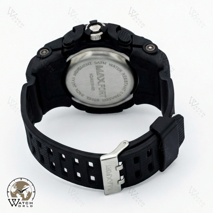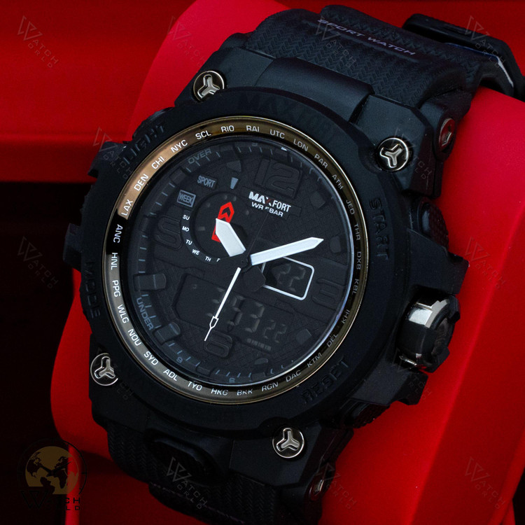 ساعت مچی دو زمانه مردانه برند اورجینال مکسفورت با موتور ژاپن و متریال قاب رزین و بند پیو باکیفیت ضددآب 5ATMبه همراه جعبه و پاکت زیبا و یکسال گارانتی.
