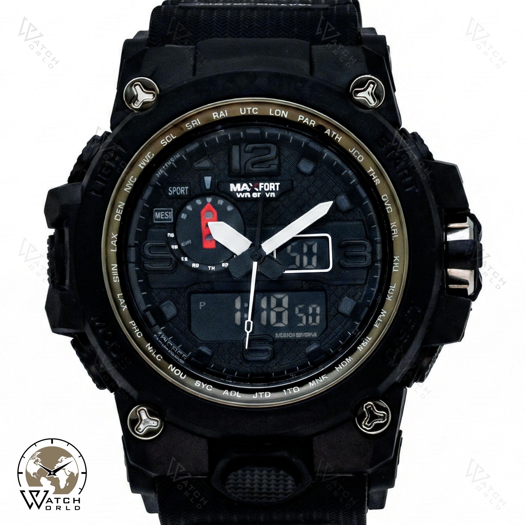 ساعت مچی دو زمانه مردانه برند اورجینال مکسفورت با موتور ژاپن و متریال قاب رزین و بند پیو باکیفیت ضددآب 5ATMبه همراه جعبه و پاکت زیبا و یکسال گارانتی.