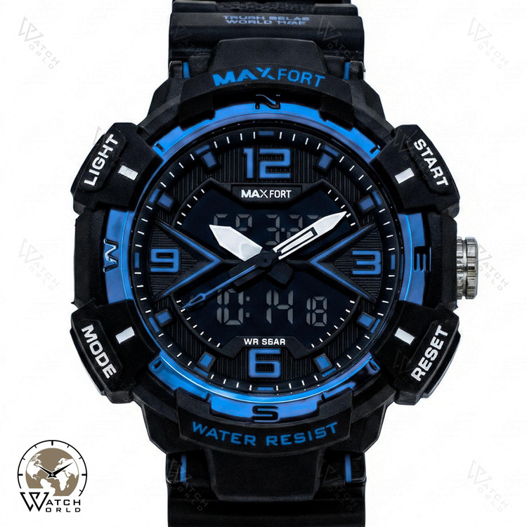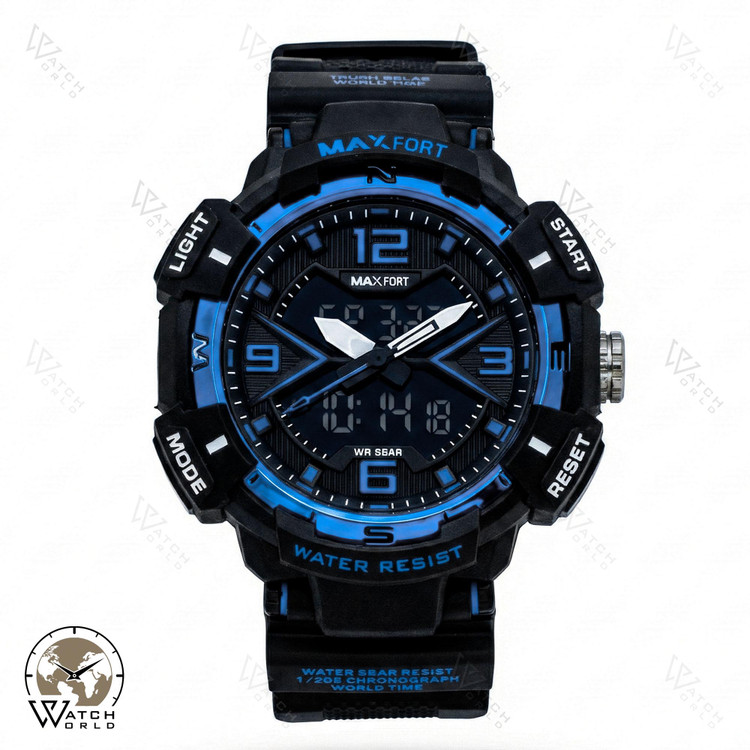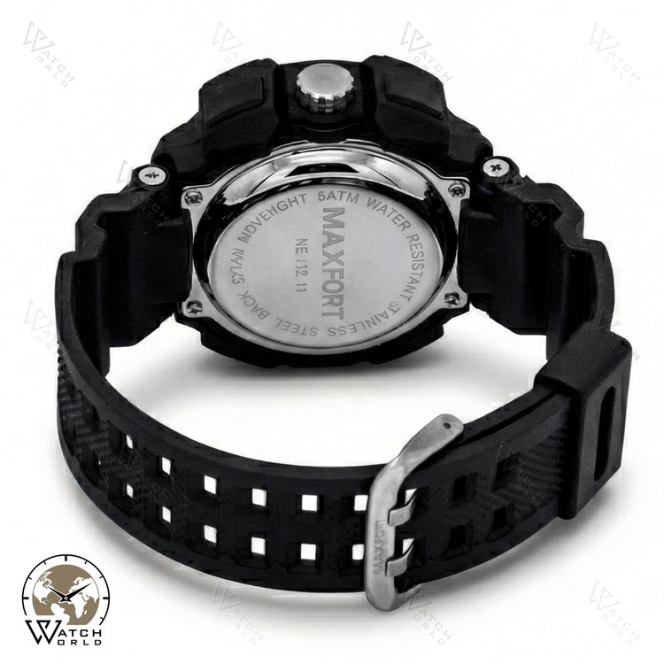 ساعت مچی دو زمانه مردانه برند اورجینال مکسفورت با موتور ژاپن و متریال قاب رزین و بند پیو باکیفیت ضددآب 5ATMبه همراه جعبه و پاکت زیبا و یکسال گارانتی.