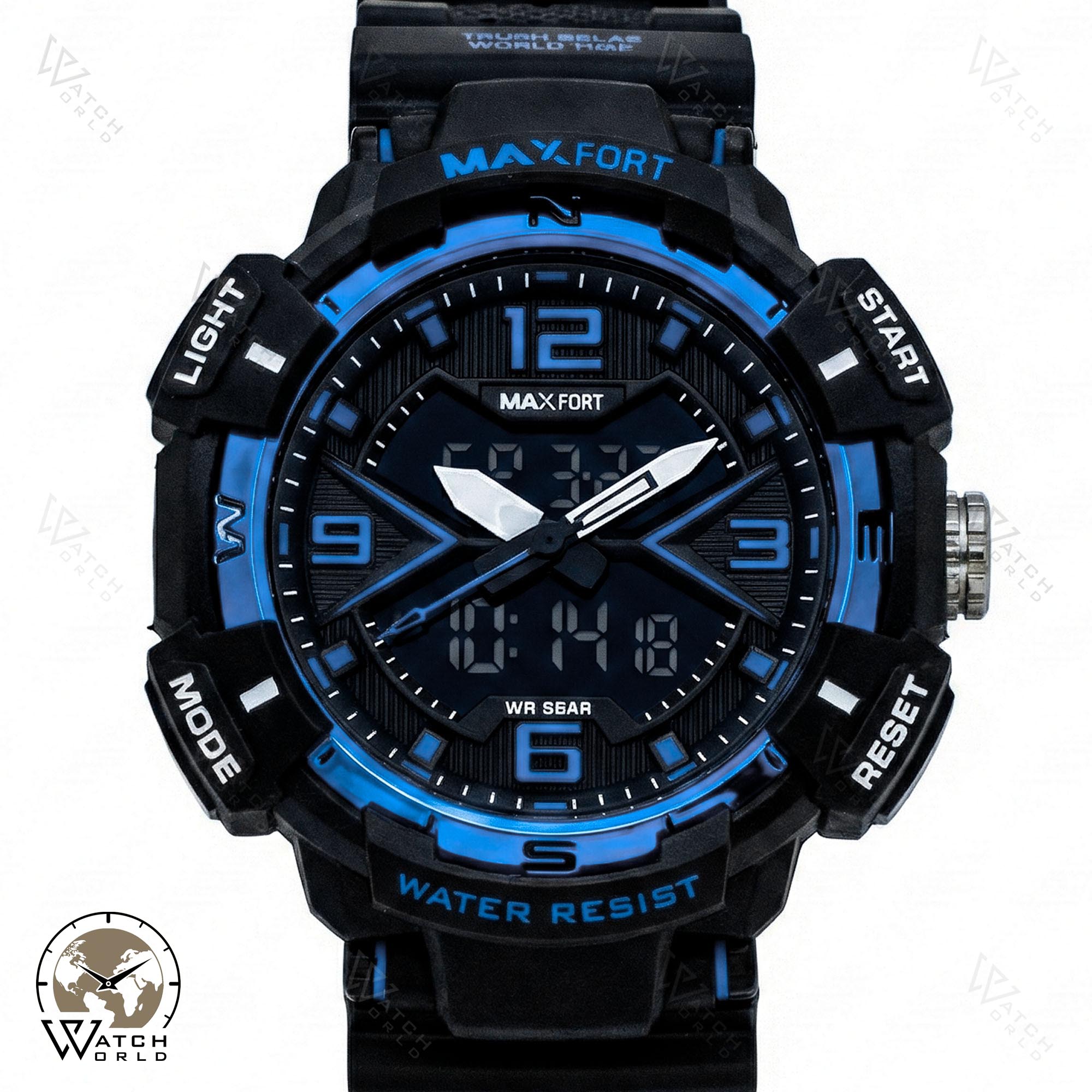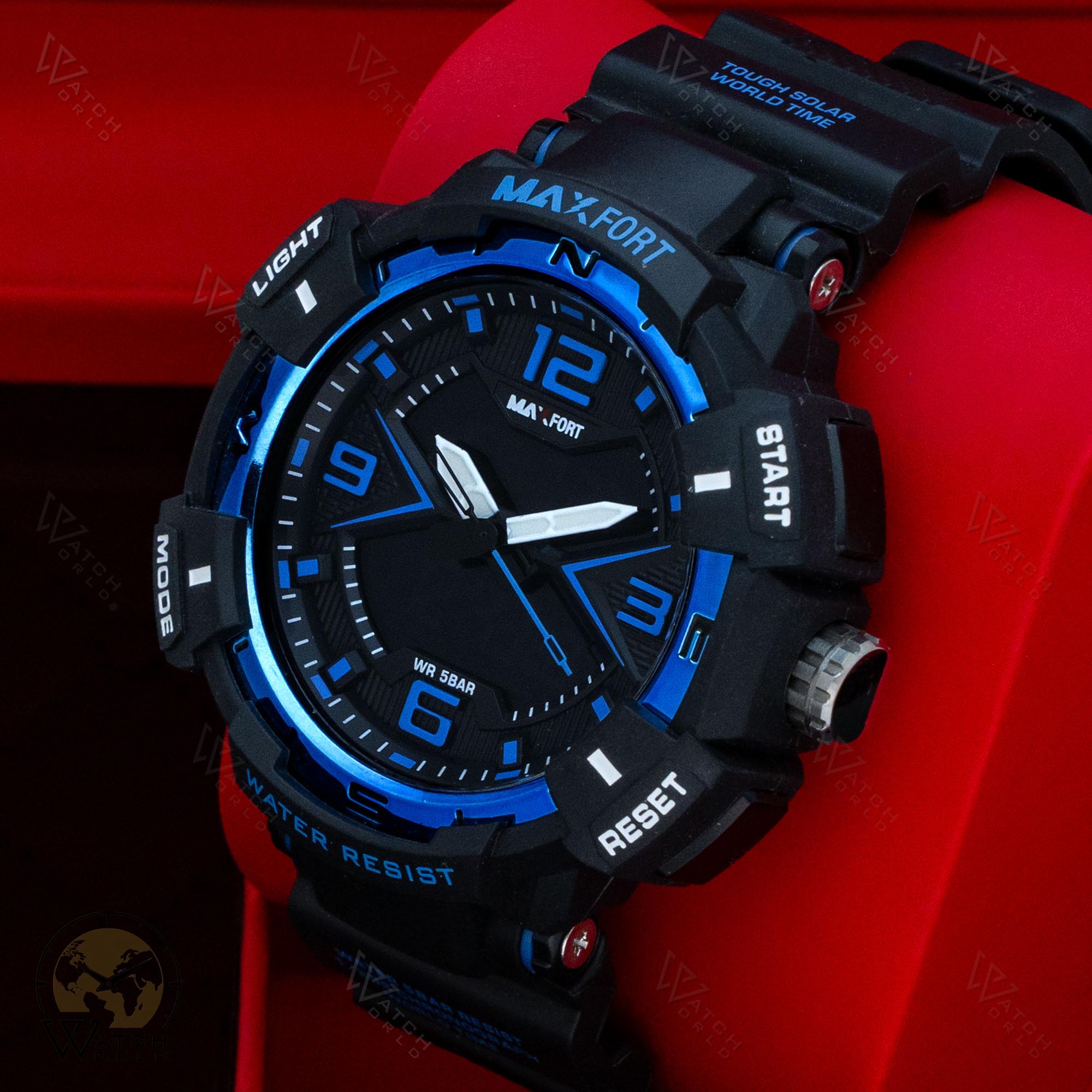 ساعت مچی دو زمانه مردانه برند اورجینال مکسفورت با موتور ژاپن و متریال قاب رزین و بند پیو باکیفیت ضددآب 5ATMبه همراه جعبه و پاکت زیبا و یکسال گارانتی.