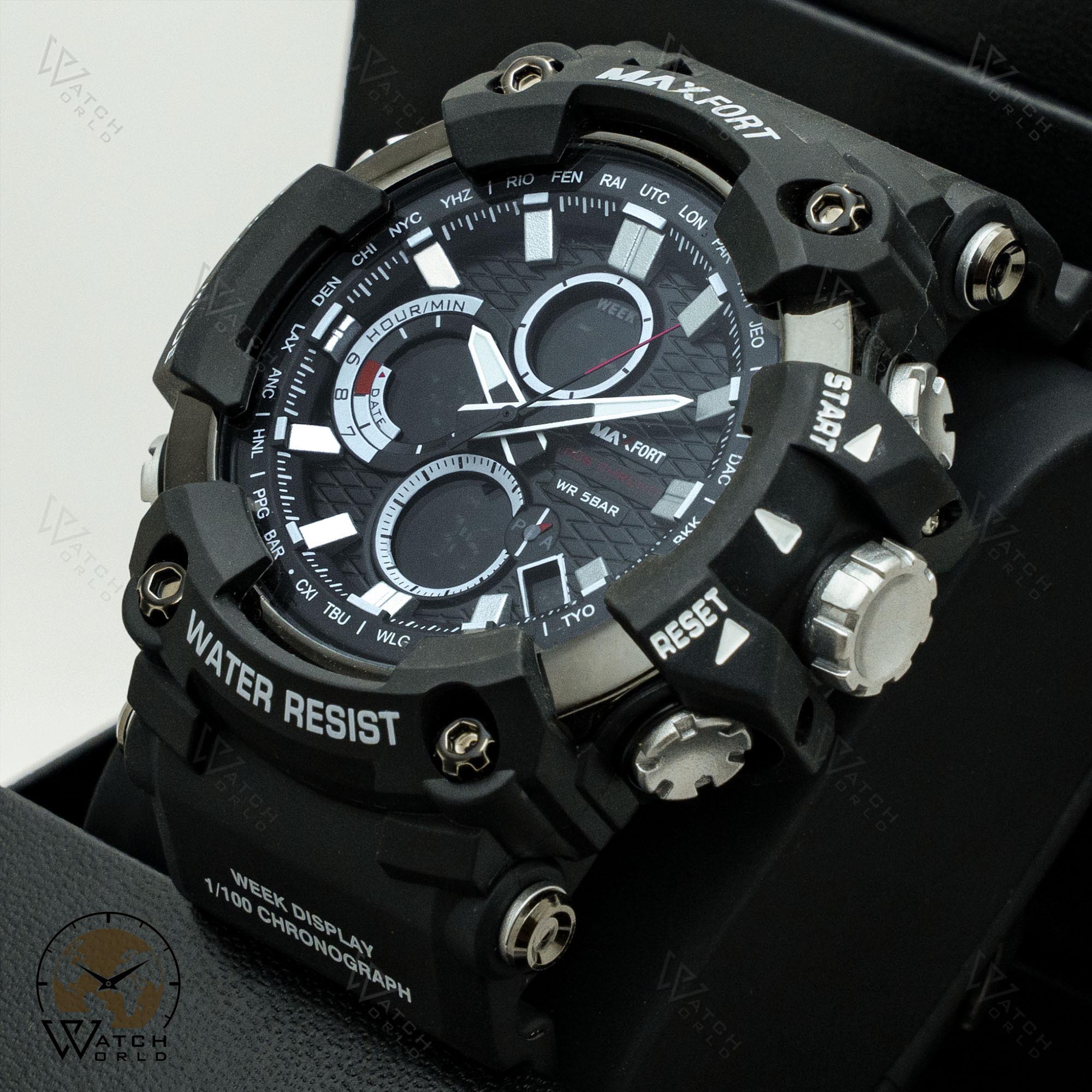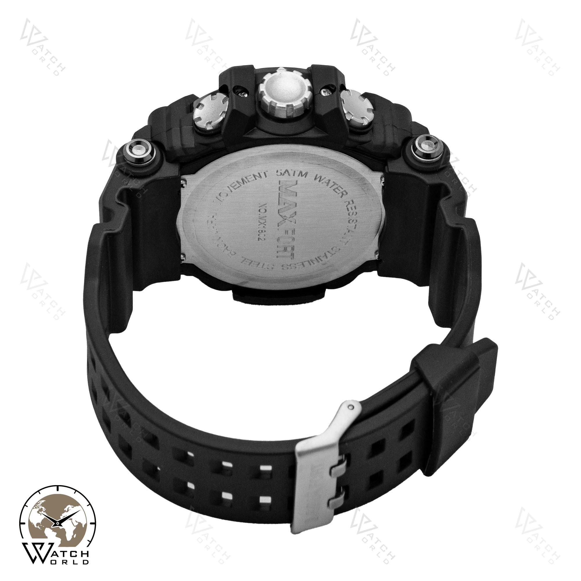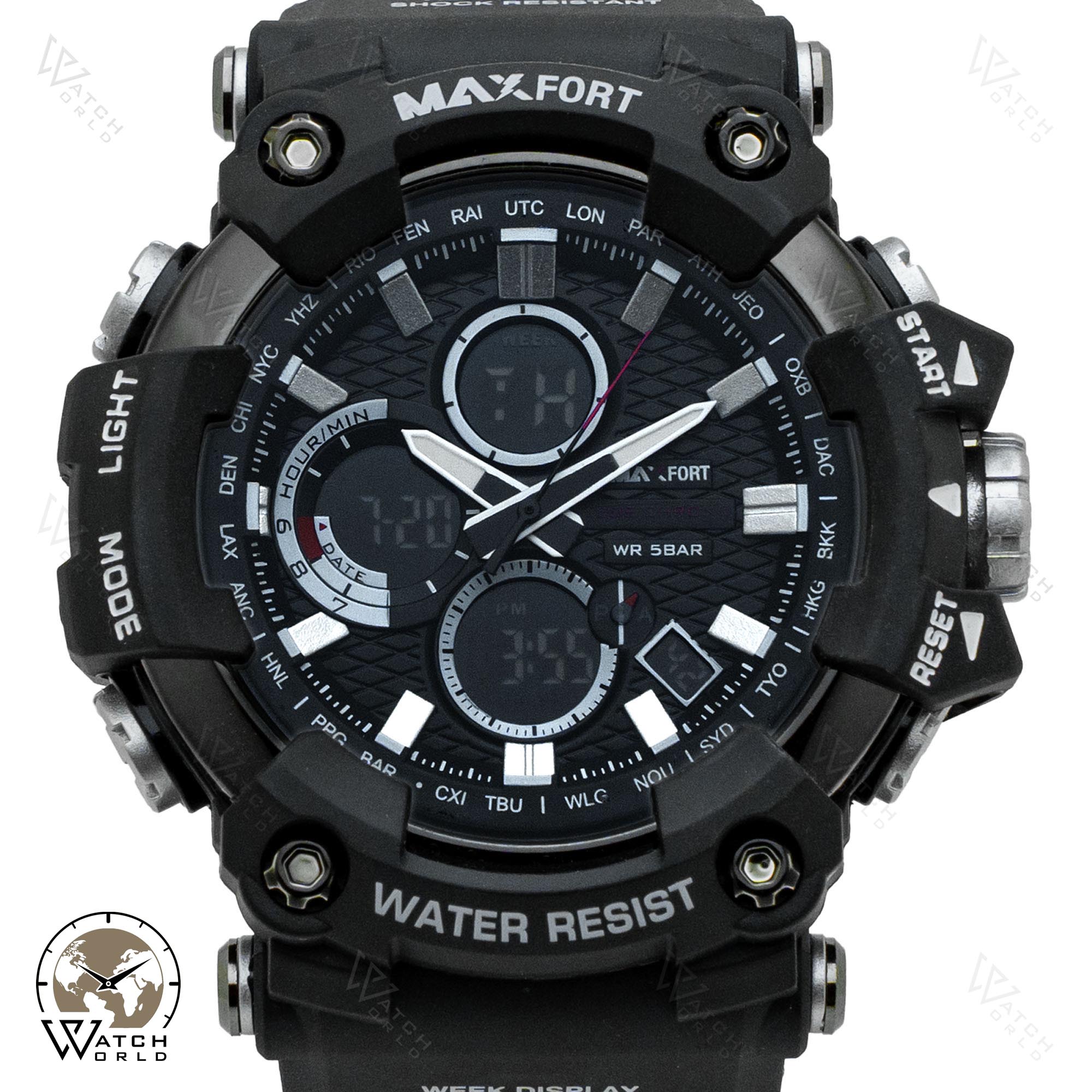 ساعت مچی دو زمانه مردانه برند اورجینال مکسفورت با موتور ژاپن و متریال قاب رزین و بند پیو باکیفیت ضددآب 5ATMبه همراه جعبه و پاکت زیبا و یکسال گارانتی.